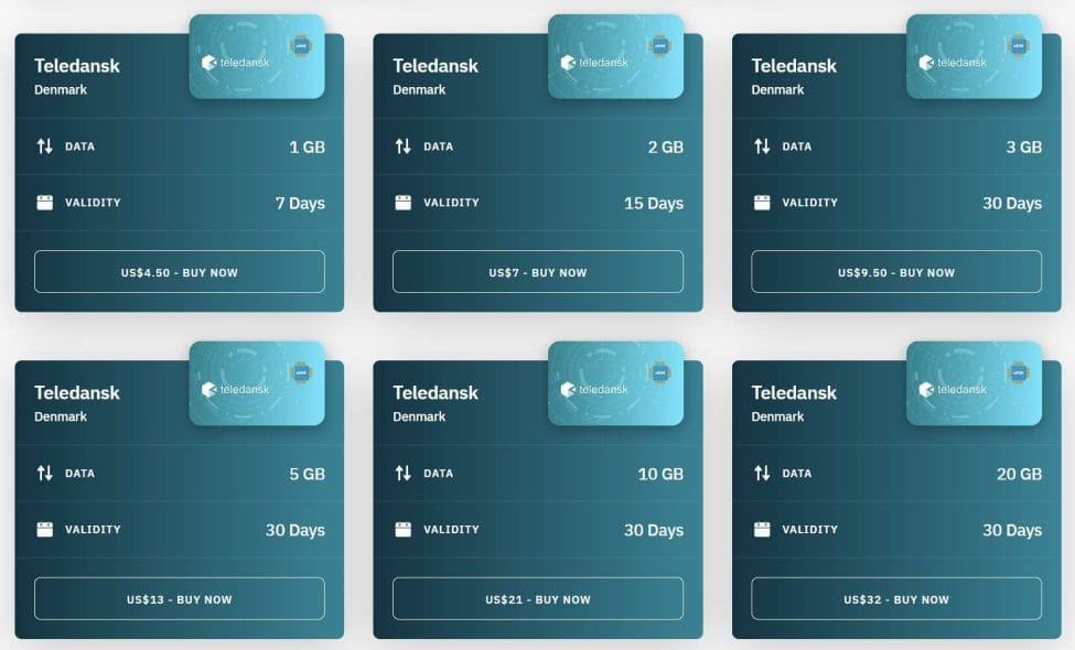 20GB of data + 1 hour calling + 1000 text messages within Europe is 43.4 Euros ($46.5 USD / 322 Danish Krone). The cheapest option is 20MB data, 2 hours calling and unlimited text messages within Europe for 5.5 euros ($6 / 40.90 Danish Krone). So these aren’t really an affordable option.